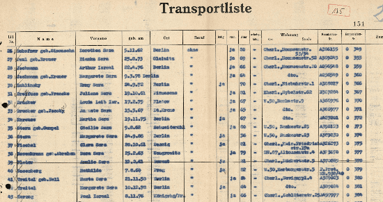 Transport list from one of the so-called transports of the elderly which took old-aged Jewish people from Berlin to the Theresienstadt ghetto (Terezin).