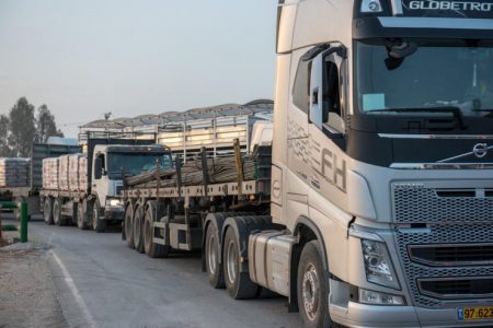 Israeli trucks carrying supply for the Gazan people, entering Kerem Shalom cargo crossing on the Israel – Gaza border. Kerem Shalom, Oct 22, 2018. Photo by Kobi Richter/TPS