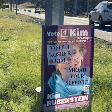 Signs for Independent ACT candidate for the senate Kim Rubenstein have been defaced with antisemitic slogans.
