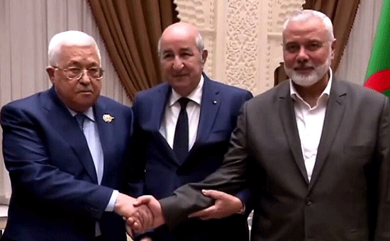Palestinian Authority leader Mahmoud Abbas and Ismail Haniyeh, head of Hamas’s political bureau, shook hands in Algeria on Tuesday, but according to analysts, they would have preferred not to.