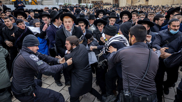 Haredi Jews scuffle with police as they protest members of the Women of the Wall movement bringing in Torah scrolls to their hold Rosh Chodesh prayers at the Western Wall in Jerusalem Old City, March 4, 2022. Photo by Yonatan Sindel/Flash90.