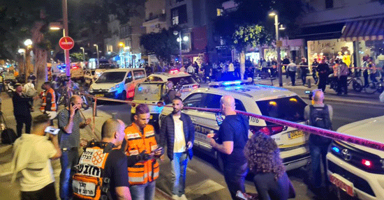 Security forces and ambulances in Tel Aviv, where Palestinian terrorist Raad Hazem killed three people in a shooting rampage, Apr 7, 2022. Photo by Nadav Goldstein/TPS