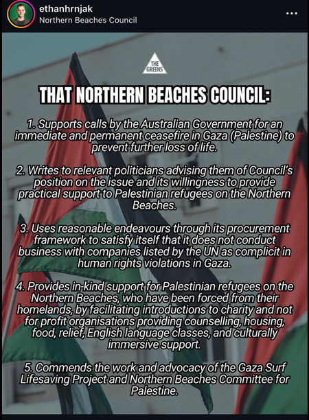 This motion calls for Council to take a formal position on the Israel–Gaza conflict, including a demand for a permanent ceasefire, a boycott of Israeli-linked companies, targeted support for Palestinian refugees on the Northern Beaches, and even an official commendation of activist groups aligned with the anti-Israel movement. This, in a chamber tasked with fixing footpaths, managing waste collection, and approving development applications.