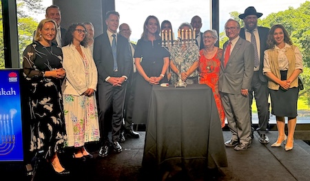 Eight members of the Jewish community were invited to take part in the menorah lighting. David Knoll, Jeremy Levy and Julia Sussman, all directors of the NSW Jewish Board of Deputies, joined Margaret Foster of the Australian Association of Jewish Holocaust Survivors and Descendants. They were followed by Philip Cohen, the Board’s longest-serving deputy, and Renee Pinshaw, who represents a wide range of Jewish organisations. Shari Lowe, the acting CEO of JCA, and Robbie Clifford, CEO of COA, completed the group, together reflecting the depth and breadth of Jewish communal leadership in New South Wales.