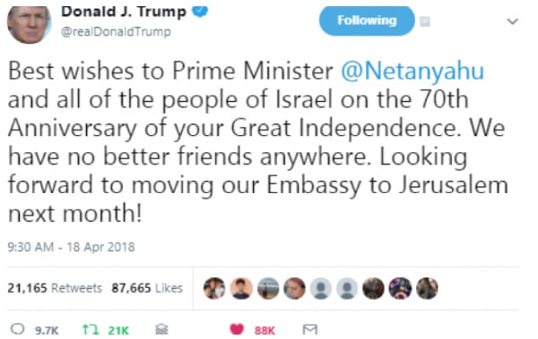 “Best wishes to Prime Minister @Netanyahu and all of the people of Israel on the 70th Anniversary of your Great Independence,” Trump tweeted on Israel’s Memorial Day on Wednesday, commemorated the day before Independence Day. “We have no better friends anywhere. Looking forward to moving our Embassy to Jerusalem next month!”