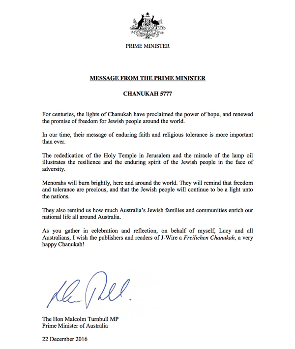 Australia’s Prime Minister Malcolm Turnbull sends a Chanukah message to J-Wire readers.