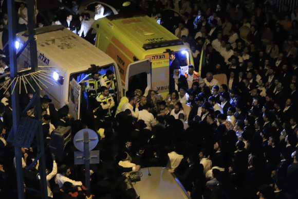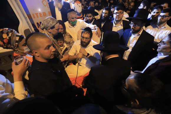 Yedidya’s father, Avigdor Hayut (holding microphone), was brought to the funeral in an ambulance hospital bed as he was also injured in the tragedy.