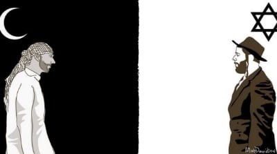 It’s not only Mark Kenny who sees the Israeli-Palestinian conflict in black and white terms. The cartoon by Matt Davidson that accompanies his piece is also highly problematic, drawing upon a clear stereotype to create an image of an Israeli Jew. In fact, ultra-Orthodox Jews, as depicted in this image make up a minority of the Jewish population of the state.