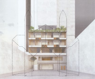 An architectural drawing of the existing Synagogue façade overlaid on the new building, as viewed from Margaret Street