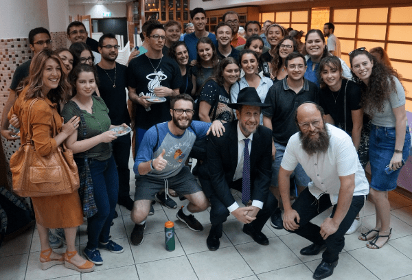 Among the young people who turned out in Jerusalem on July 8, 2019, to celebrate the Lubavitcher Rebbe on his 25th yahrtzeit was London’s Rabbi Yitzchak Schochet (first row, second from right), who came to inspire the crowd. Photo by Shoshana Reiter Halpern.