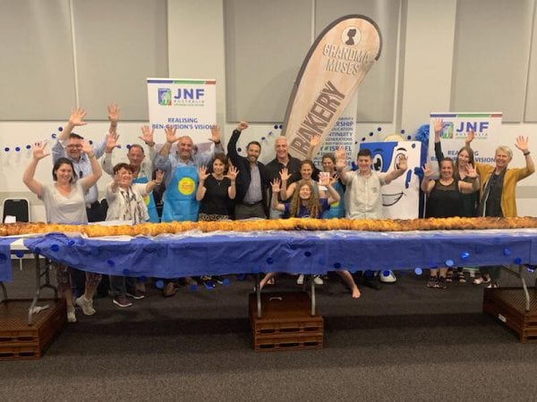 While the Shuk was in full swing, something truly remarkable was happening across town at Maroubra Synagogue: JNF together with Grandma Moses attempted to break the Guinness Book World Record for a longest braided loaf of bread. The record had been set in Brooklyn in 2016 with a twenty-foot (approx. 6m) challah. The attempt was successful and they baked a 10m long challah that took 12 hours to bake and a whopping 70kg of dough. Local Jewish Day schools were present throughout the day to assist. News of this feat has even reached Israeli papers.