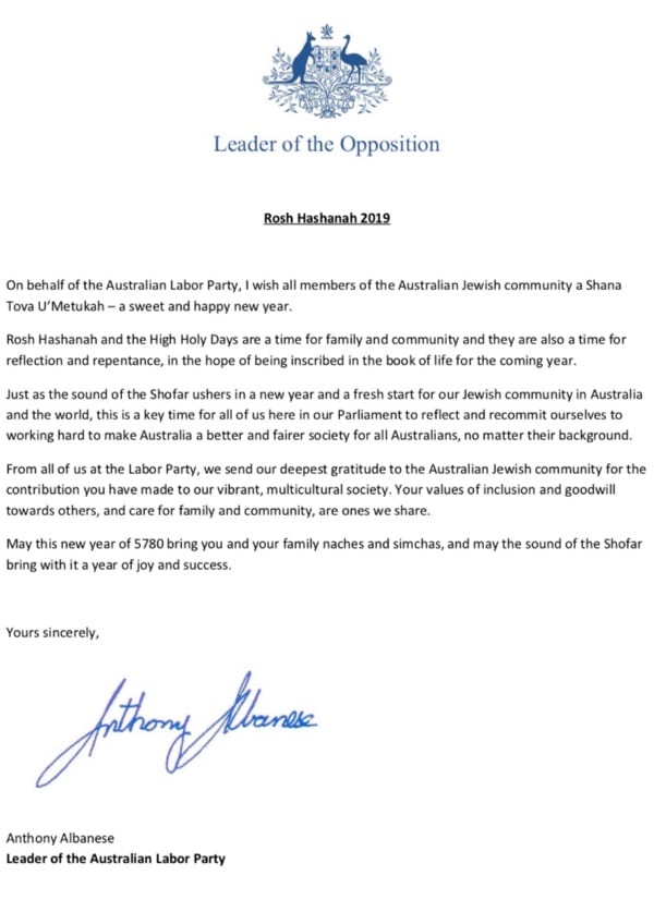 The Leader of Opposition in the Australian Parliament Anthony Albanese sends greeting to the Jewish community…