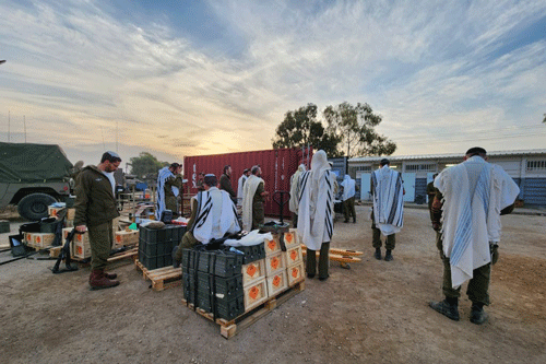 Israeli army reservists called up for duty say morning prayers at a muster point on Oct. 10, 2023. Photo by TPS