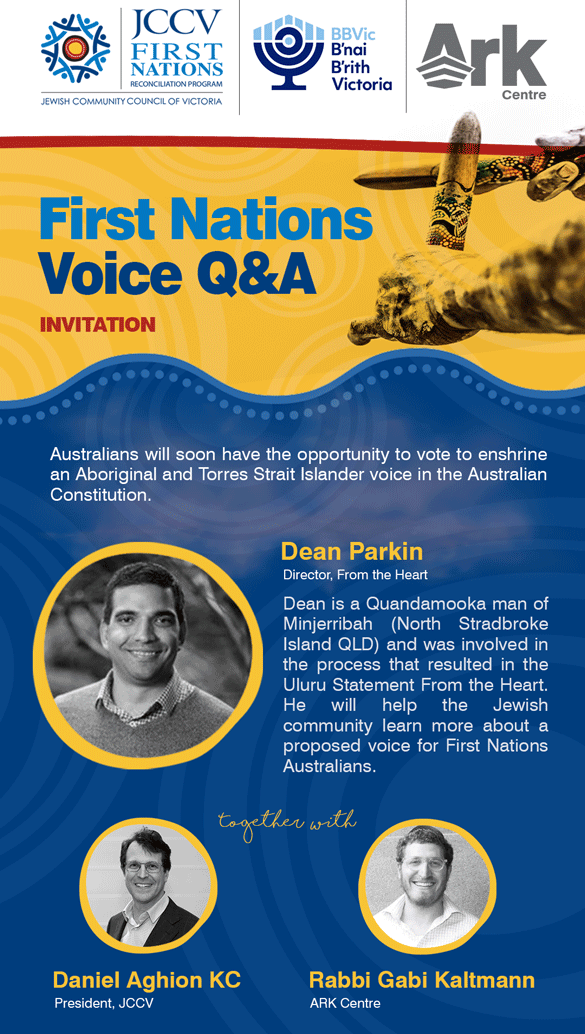 The Jewish Community Council of Victoria (JCCV), together with B’nai B’rith, the Ark Centre and Stand Up, have invited a First Nations leader to help educate the Victorian Jewish community ahead of this referendum.