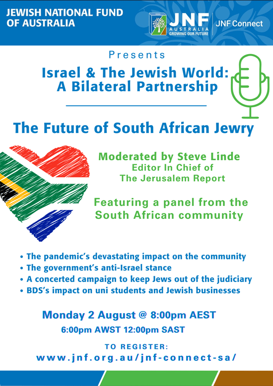 JNF will host a South African webinar on Monday night where they will interview members of the community – Dr Daniel Israel – community GP, Mike Abel – M&C Saatchi Abel, Mary Kluk – SAJBD and Michael Kransdorff – JNF SA.