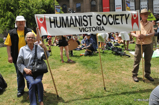 Halina and the writer Geoff Allshorn(left), holding the Humanist banner at a Marriage Equality Rally, Melbourne, 24 Nov 2012 aloft. Photo (c) 2012 by Michael Barnett.