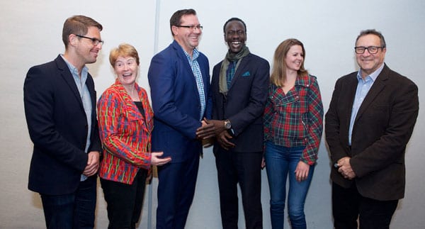 Brandon Srot, Claire Mallinson, Professor Lindon Coombes, Deng Adut, Rani Vincent, Emeritus Professor Andrew Jakubowicz. Photograph by Giselle Haber.