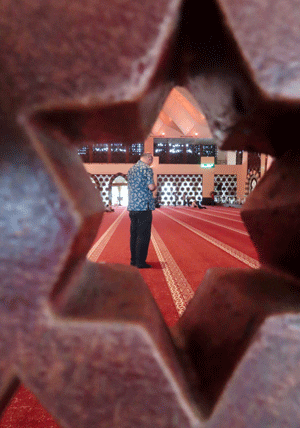 Jeremy Jones photographed through Magen David shaped latticework , saying Mincha in Grand Mosque in Padang, Sumatra