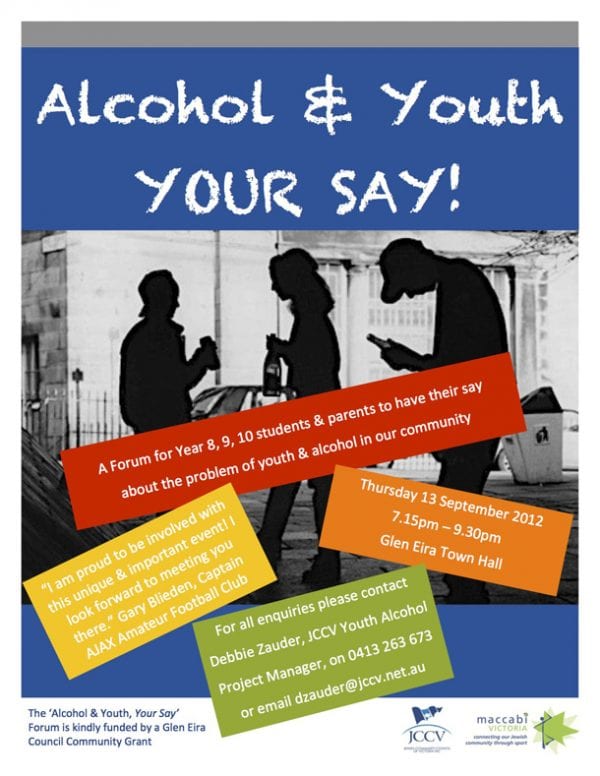 The Jewish Community Council of Victoria (JCCV) and Maccabi Victoria have joined forces to present a unique and exciting Forum, ‘Alcohol and Youth, Your Say!’ targeted at Jewish Year 8, 9 and 10 students and their parents/guardians.
