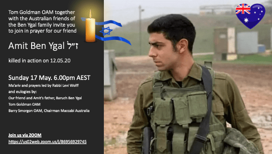 21-yr-old Amit Ben Ygal was killed on active duty on the West Bank last Monday night. His heart-broken father has been more than a friend to Maccabi Australia since 1997 when he saved a drowning athlete at the Maccabiah bridge disaster.
