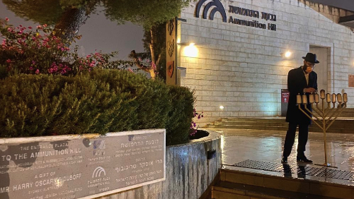 In pouring rain and standing on the ground which symbolizes heroism, sacrifice and victory, guests broke out in song and danced in the light of the Chanukah candles.