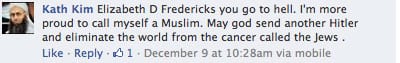 In response to an Amnesty petition against Israeli settlements, one comment from “Kath Kim”, which continues to appear on Amnesty Australia’s Facebook page after five days, reads “May god send another Hitler and rid the world from the cancer called the Jews”.