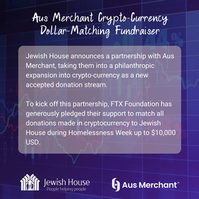 Aus Merchant processes all cryptocurrency donations for Jewish House and is a safe, secure, fast and unique way for philanthropists to make a difference in people’s lives here in the local community. Aus Merchant is committed to supporting Jewish House in its work to end homelessness.