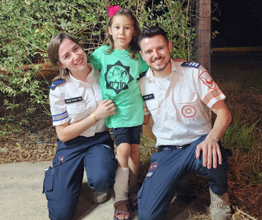 Ofek had lost quite a bit of blood, but she was very calm, not crying at all. We transferred her to the intensive care unit and began to give her medical treatment. At the same time, the soldiers who were there said that her parents were also injured by gunfire, but they did not know their condition. We realised that more injured people were expected to arrive at the junction, and we sent a report to the MDA dispatch centre in order to send more helicopters and intensive care vehicles to us.