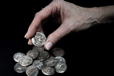A rare wooden box containing 15 silver coins dating to the reign of Antiochos IV was discovered in May during an excavation in the Darageh Stream Nature Reserve overlooking the Dead Sea. The IAA said they were found in a wooden box discovered in a crack in the cave.