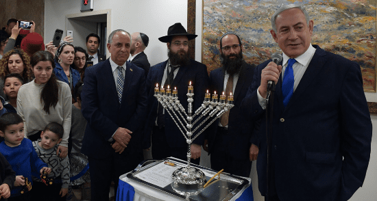Prime Minister Benjamin Netanyahu told his staff and their families: “I tell all of the adorable boys and girls here, and the employees of our office, we bring much light to the State of Israel. If the Maccabees who fought for our existence almost 2,000 years ago could have looked forward and seen that their descendants would establish a state that is now ranked as the eighth strongest in the world and that countries ranked above us have hundreds of millions [of people] and we have only nine million – then we are the Maccabees.