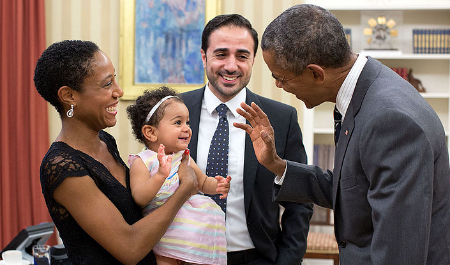 President Obama exchanges a wave with Alya Dorelien Bitar, one-year-old daughter of Maher Bitar, the outgoing National Security Council Director for Israeli and Palestinian Affairs, and his wife, Astrid Dorelien, during a family photo in the Oval Office. (Official White House Photo by Pete Souza, September, 2015)
