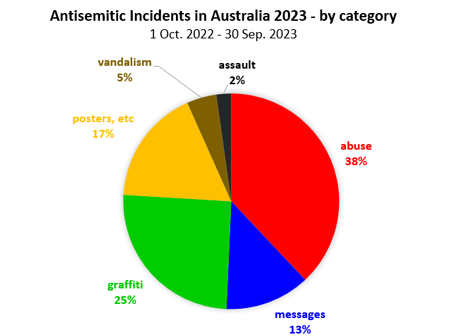 Overall, during the reporting period from 2022 to 2023, there were substantial increases in the number of reported incidents in three categories: assault (up 120% from 5 to 11), vandalism (up 100% from 11 to 22) and verbal abuse (up 36% from 138 to 188). There were significant decreases in two categories: messages (down 17% from 76 to 63) and posters (down 30% from 123 to 86). Graffiti remained the same at 125. Of note, most of the incidents of assault were generally mild, people throwing objects at Jews, slapping and pushing Jews rather than assault causing serious physical harm.
