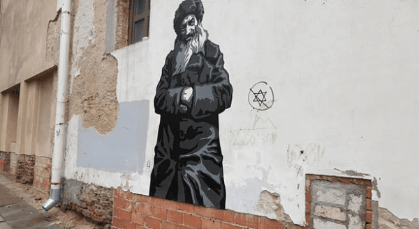Anti-Semitic graffiti found on a wall mural commemorating Jewish life in Vilnius, Lithuania. Source: Facebook.
