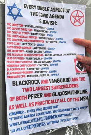 The Jerusalem Post has reported that Australians “with Jewish background or names” are members of the U.S. Centres for Disease Control and that two companies mentioned on the flyer are major shareholders in Pfizer and UK-based pharmaceutical company GSK.