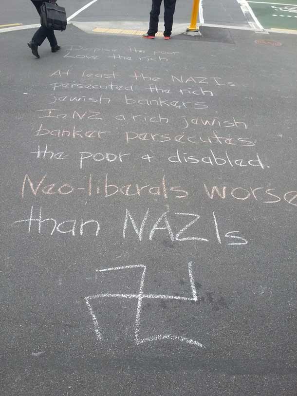 An elderly couple was heckled as they chalked antisemitic graffiti on a pavement in the CBD of New Zealand’s capital city Wellington.