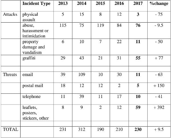 Attacks (assault, abuse, vandalism, and graffiti) accounted for 63% of the total number of incidents, with 14 incidents. Threats (email, letters, telephone, leaflets) accounted for 37 % of the total number of incidents, with 85 incidents. There is also much anecdotal evidence of incidents which go unreported .