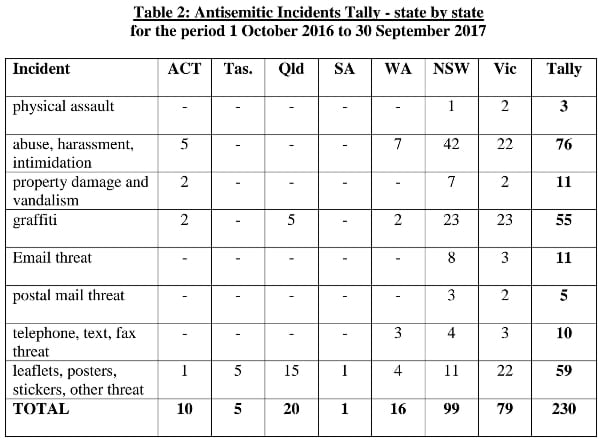 The Report on Antisemitism in Australia was published by the Executive Council of Australian Jewry and covers the 12 month period ending on September 30, 2017.