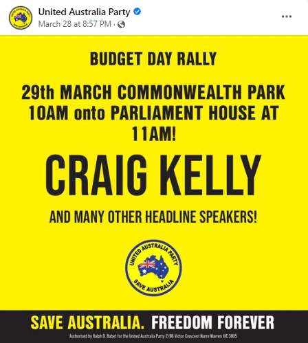 A rally took place on the lawns of Parliament House in Canberra on Tuesday 29 March 2022 organised by the United Australia Party (UAP). Its advertisement in UAP-yellow labelled it the “Budget Day Rally” to begin at “Parliament House at 11am”, with “Craig Kelly and many other headline speakers.” Nothing out of the ordinary.