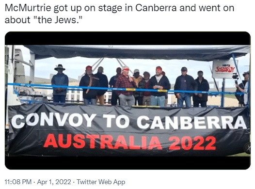 “Sov cit Mark McMurtrie, guest speaker at today’s @UnitedAusParty Parliament protest led by Craig Kelly, tells the rally that if they’re worried about standing under the Jews they should shun the Union Jack, which he says is secretly a Jewish symbol.”