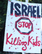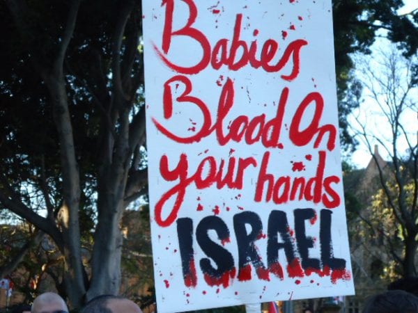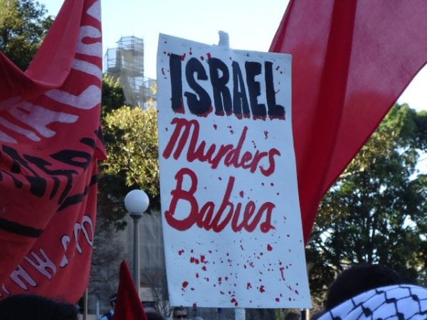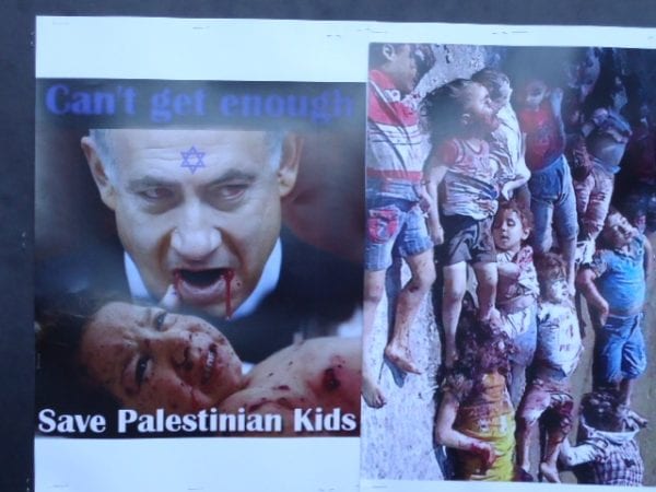 Most disturbing were the placards that claimed that Israel deliberately kills children. In large red writing were painted the words “Babies Blood on your hands Israel” and “Israel murders babies”, with red spatters over each placard. Other placards said “Israel stop killing kids” and “If you want to live stay away from children”.