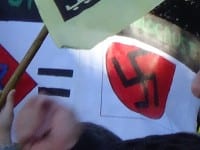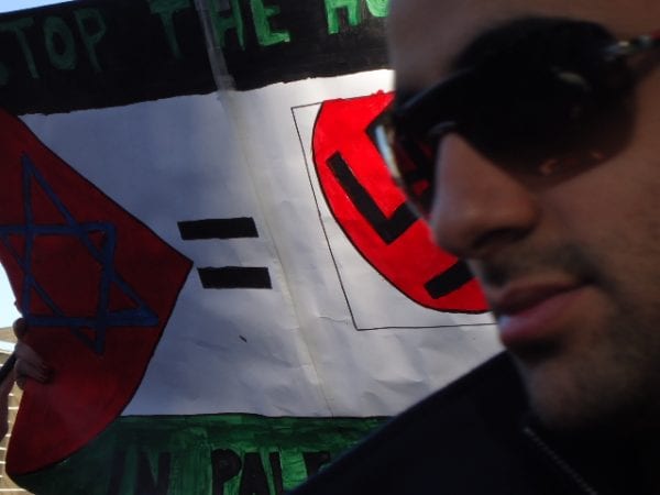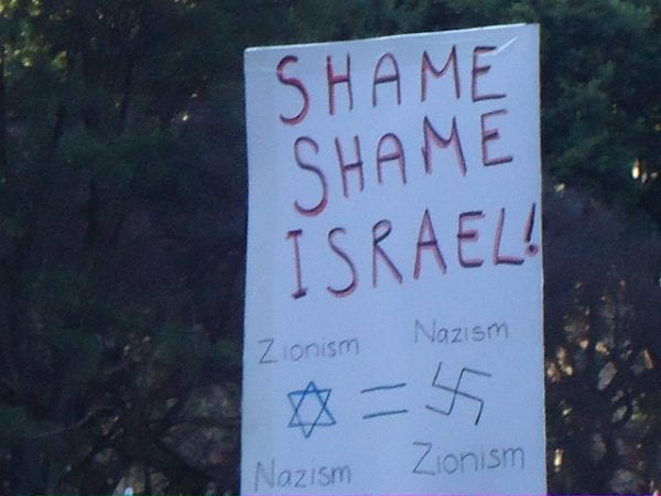 Some of the antisemitic slogans from previous weeks were gone, but these were replaced with others. A particularly nasty placard had the Star of David equaling a swastika, with the words “Stop the Holocaust in Palestine”. Another placard also had the Star of David equaling the swastika and the words “Shame shame shame Israel, Zionism = Nazism, Nazism = Zionism”.
