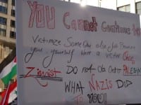 Other posters were emblazoned with themes denigrating Jews and Judaism, and equating Israel with Nazi Germany. These posters included the words: “Khazar Jews out of Palestine”, “God chosen who?”, “Gaza is the Warsaw ghetto”, “God is not your real estate agent”, “First it was Hitler….. Now it is Israel!” and “You cannot continue to victimize someone else just because you yourself were a victim once. Zionist do not do onto Palestine what Nazis did to you!