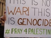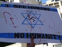 There were many mock-ups of the Israeli flag. Some replaced the Star of David with a swastika, others embedded a swastika inside the Star of David. One had the Israeli flag, with a swastika inside the Star of David, bespattered with red as though it was blood, and the words “See humans but no humanity”
