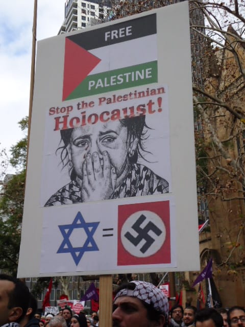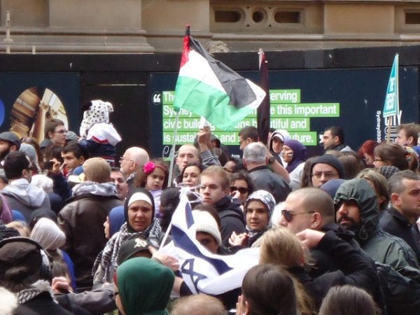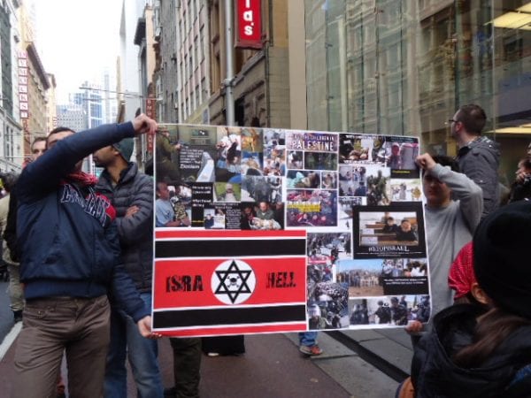 Sunday’s anti-Israel rally in Sydney attracted a somewhat smaller crowd than last week’s, but the flags, placards and sentiments were much the same.