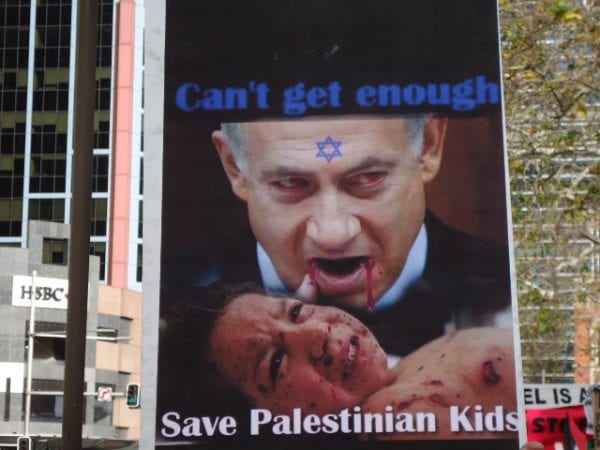 One image played directly to the Blood Libel (the myth that Jews use the innocent blood of non-Jews for religious rituals). It was an image of Bibi Netanyahu with blood dripping from his mouth and holding a blood-spattered child. A Star of David was stamped on Netanyahu’s forehead. Above the image were the words “Can’t get enough”, the implication being not enough blood. Below the image were the words “Save Palestinian Kids.” For millennia, Jews were falsely accused of killing gentile children and drinking their blood, leading to massacres of whole Jewish communities. This libel has been adapted for contemporary purposes to foment racism against Jews, both Israeli and in the diaspora.