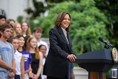 U.S. Vice President Kamala Harris speaks at a White House event recognizing NCAA championship teams from the 2023-2024 season. Credit: White House.