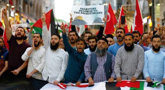 Protesters in Turkey demonstrate against the Trump administration’s “Peace to Prosperity” conference and Mideast peace plan in Bahrain, July 2019. Credit: TRT Arabic, Turkey.