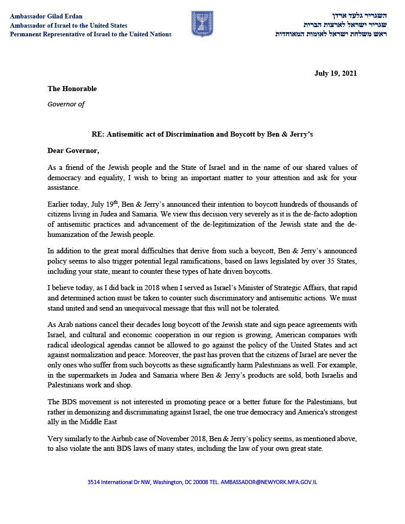 Ambassador of Israel to the United States and Permanent Representative of Israel to the United Nations – Gilad Erdan – in coordination with Israel’s Foreign Minister – Yair Lapid – wrote to the Governors of those 35 American states urging them to take action under their legislation – calling Ben & Jerry’s decision: