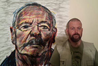 Thomas Delohery with his portrait of author and Holocaust Survivor Henri Korn