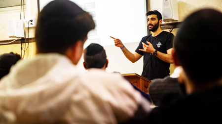 Israeli army reservist Kfir Doyeb shares his story of fighting in Gaza with students of the Agadelcha ORT high school yeshiva in Jerusalem on March 19, 2024. Photo by Kobi Natan/TPS